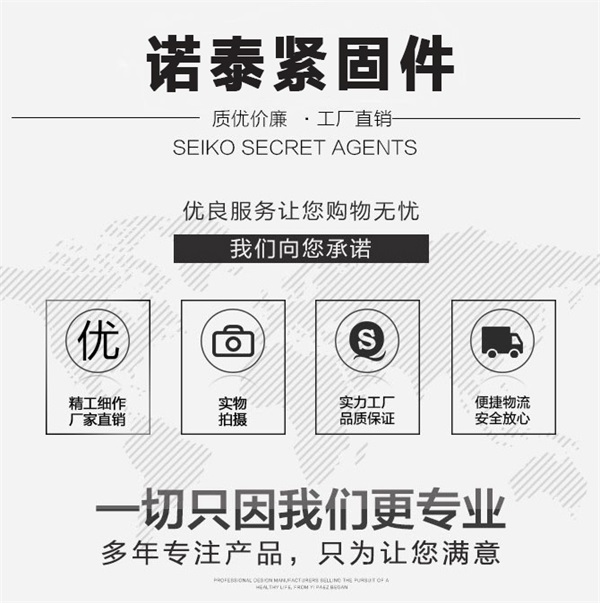 邯鄲市諾泰緊固件制造有限公司座落在中國(guó)緊固件制造基地--河北省邯鄲市永年區(qū),地處京廣線107國(guó)道、京珠高速公路和永河公路交匯處,地理位置優(yōu)越,交通十分便利。公司本著"以質(zhì)量求生存,以質(zhì)量求發(fā)展,向質(zhì)量要效益"的宗旨,以良好的品質(zhì)、貼心的服務(wù)和合理 的價(jià)格竭誠(chéng)為廣大客戶(hù)提供服務(wù)。